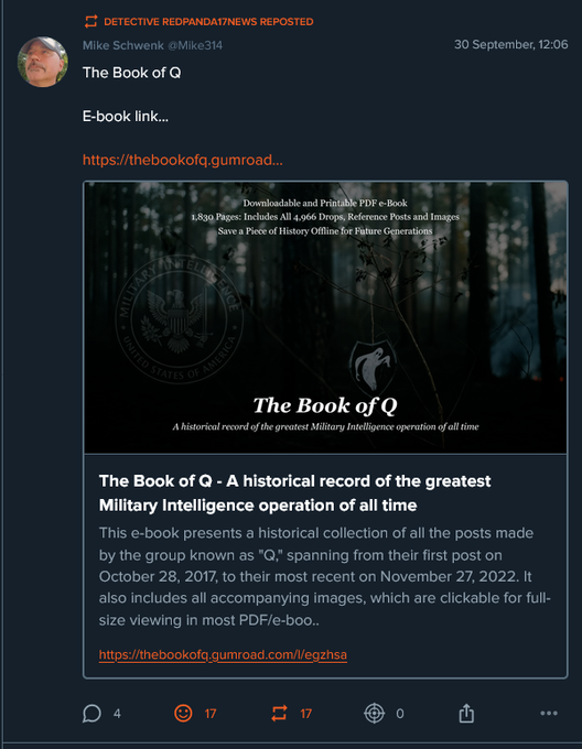 This e-book presents a historical collection of all the posts made by the group known as "Q," spanning from their first post on October 28, 2017, to their most recent on November 27, 2022. It also includes all accompanying images, which are clickable for full-size viewing in most PDF/e-boo..