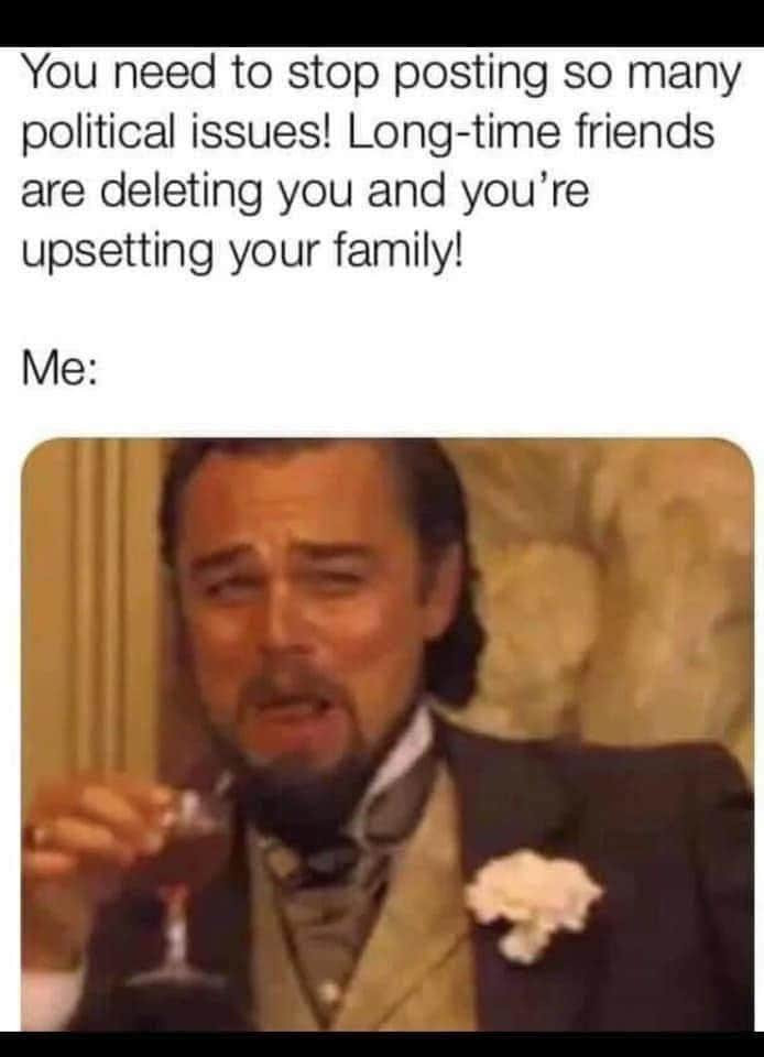 Shit I don’t need political opinions to drive family and friends away. It’s just bonus fun for me 🤪🤪🤪🤪