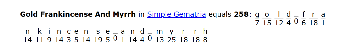 Thank you, Big year, I'm 33 , born on the day of the feast of immaculate conception, I was born 11:10 PM, and my full name = 258 simple gematria, same as "gold frankincense and myrrh"